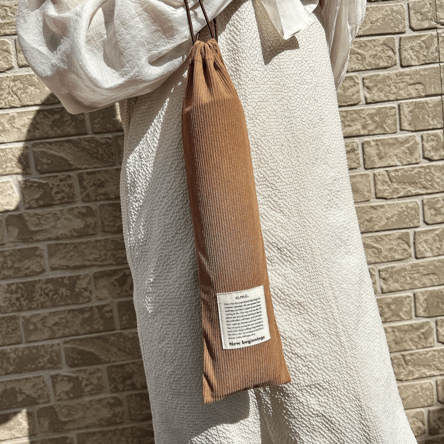 温かみのあるコーデュロイ生地を使用し、手触りからも こだわりを感じられる収納ケースです。お気に入りのプ レイマットをしっかり守りながらも、ファッションアイ テムのように持ち歩けます。
